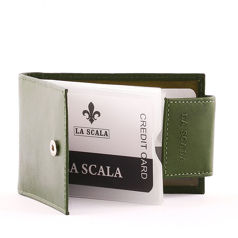 Porte-cartes en cuir de vachette de haute qualité, en vert , avec un interrupteur externe breveté avec l'inscription La Scala. Carte intérieure et classeurs.