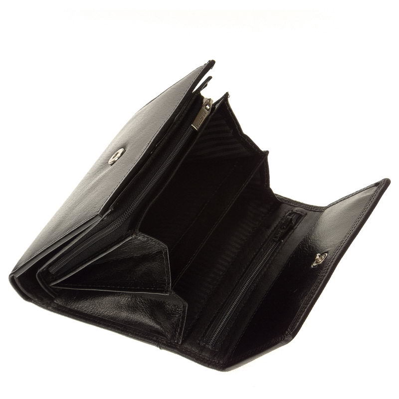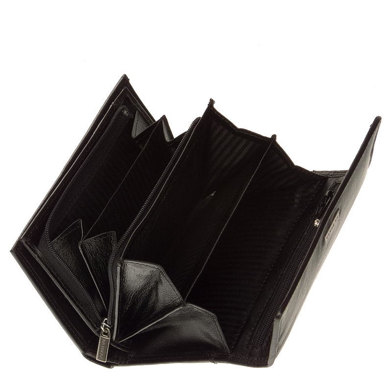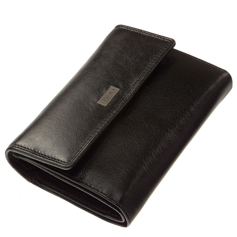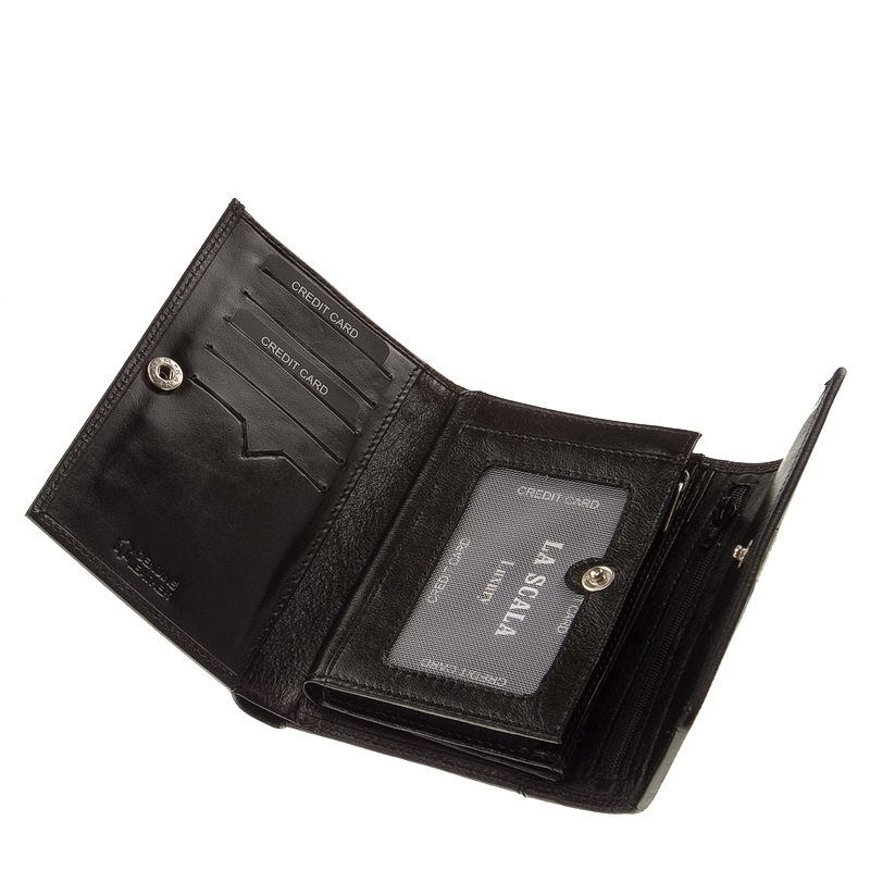 LA SCALA fém logóval ellátott, prémium kategóriás női pénztárca. Fedele patenttal zárható. Belsejében található a lepatentolható kártya- és irattartó rész, a pénztárca ezen kívül több papírpénztartóval és egy cipzáras aprópénztartóval is rendelkezik. Hátuljában egy további irattartó rekesz helyezkedik el.