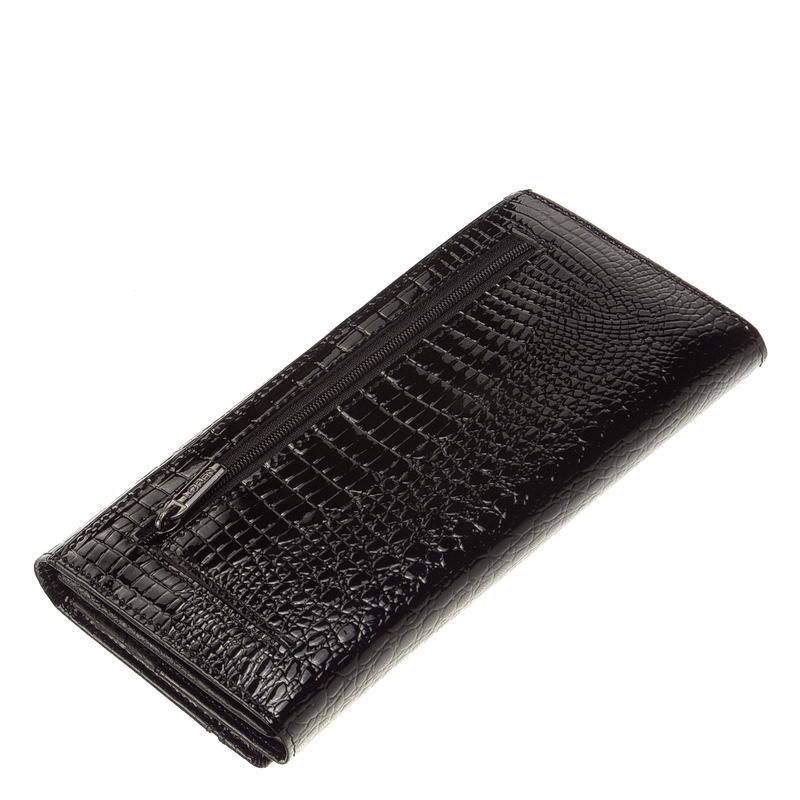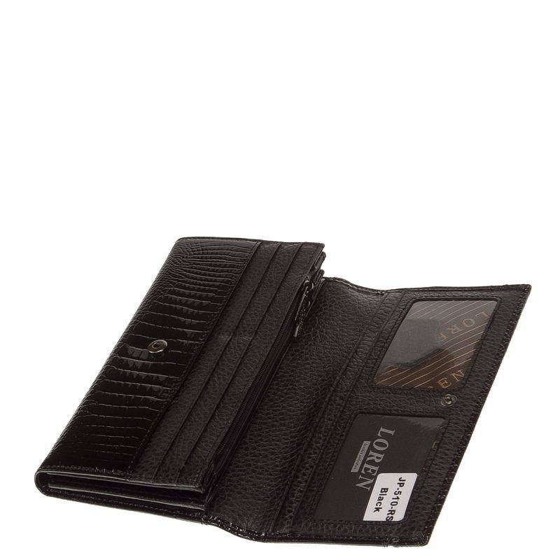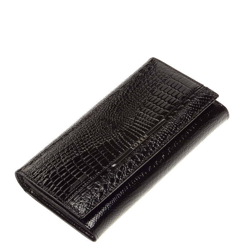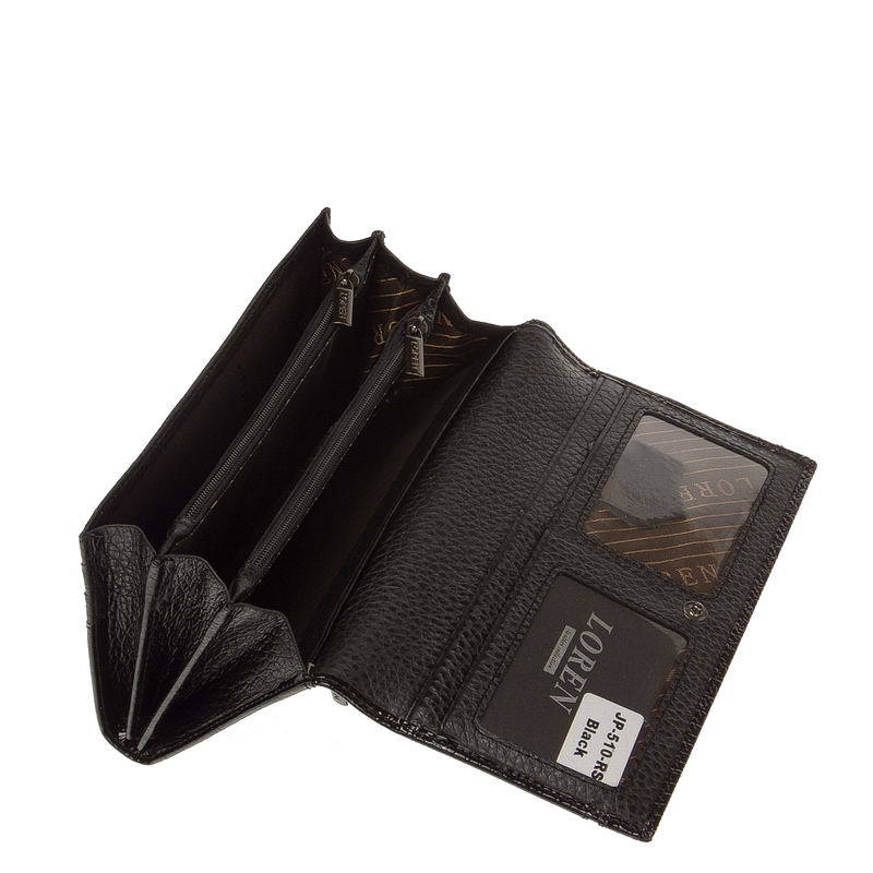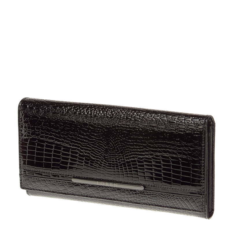 Minőségi fényes lakk bőrből készült, patenttal zárható nagyméretű LOREN női pénztárca krokodil mintával. Elején fém LOREN logó található. Több rekeszes papírpénztartóval és cipzáras aprópénztartókkal, amelyek a papírpénztartók között található. Belül kártya és irattartó rekeszekkel. Hátulján egy nyitott és egy zárható irattartó zseb található.