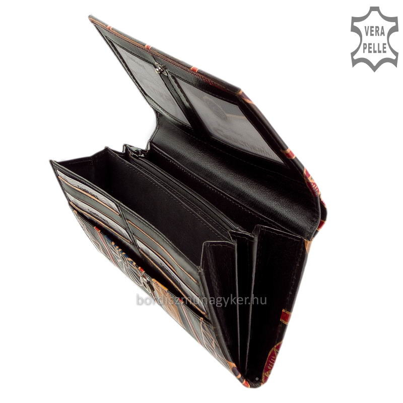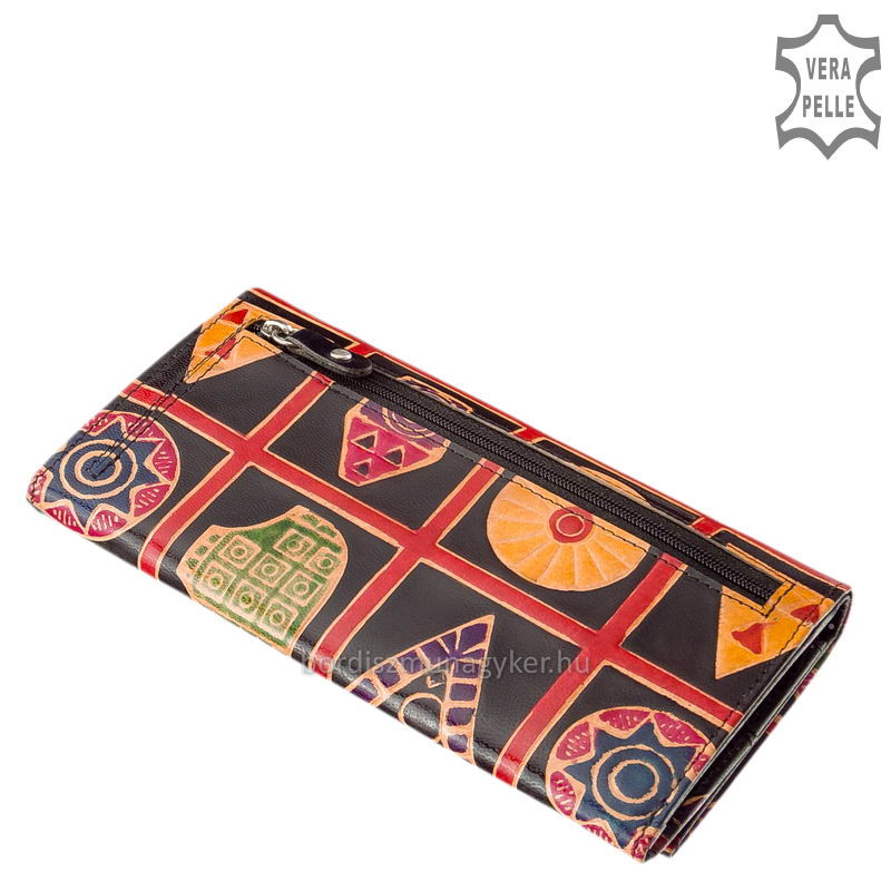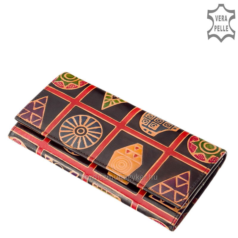 Igazi marha bőrből készült kézzel festett mintával ez a minőségi női pénztárca, melynek valódi bőr külsejére dekoratív mintás nyomat került.
