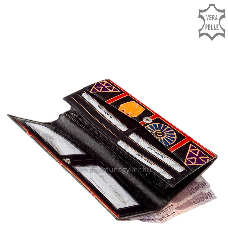 • A nagy méretű női pénztárca kézzel festett, divatos fedele biztonságosan, patenttal záródik.