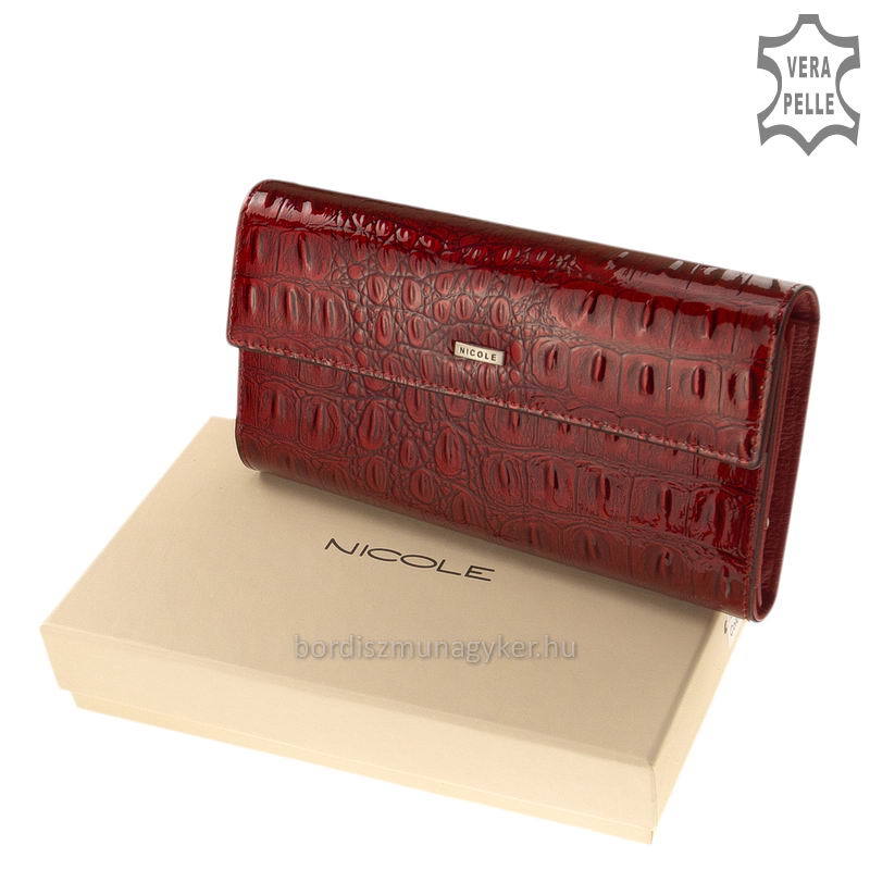 Minőségi fényes lakk kroko bőrből készült exkluzív női pénztárca, fedelén igényes, fém NICOLE márkejelzéssel. Belseje puha nappa bőr. Fedele patenttal zárható. Három darab papírpénztartóval és egy kertes, belül két rekeszre osztott aprópénztartóval. Belül a fedél alatt oldalra kihajtható, patenttal zárható irattartó és kártyatartók helyezkednek el. A pénztárca hátuljában egy további cipzáras zseb található.