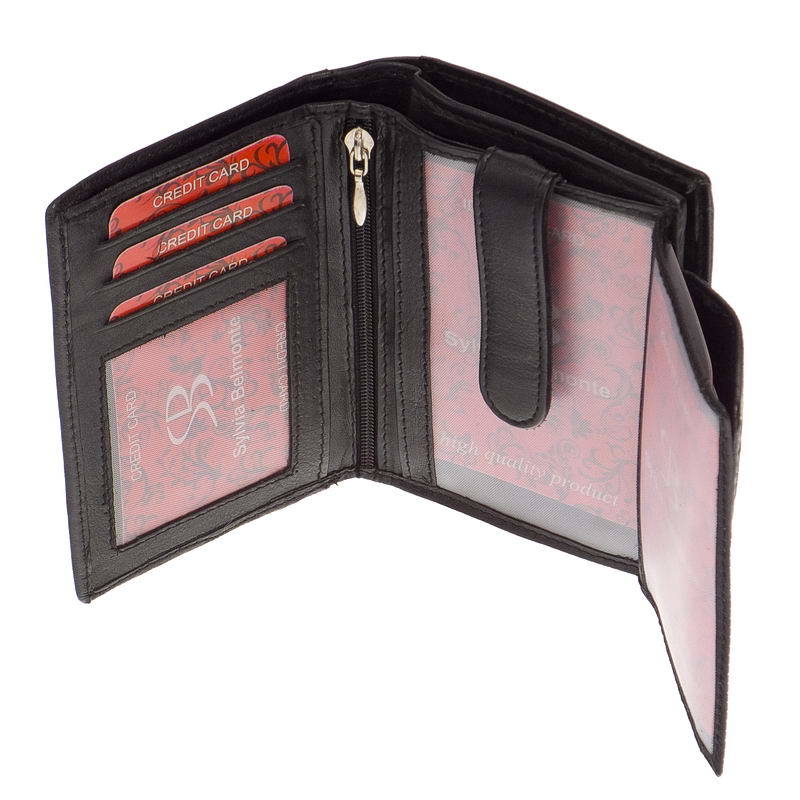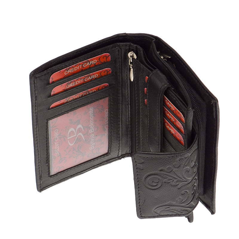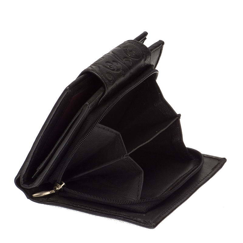 Virágnyomással díszített, finom marhabőrből készült női pénztárca, fekete színben. Patenttal zárható, széles átkapcsoló nyelvvel rendelkezik. Belsejében papírpénztartók, valamint irattartó és kártyatartó rekeszek találhatók, amelyek jobb oldalon átkapcsoló nyelvvel zárhatók. Középen egy cipzáras zsebbel ellátva. A pénztárca hátuljában lett kialakítva a cipzáras aprópénztartó, melyet egy elválasztó oszt ketté.