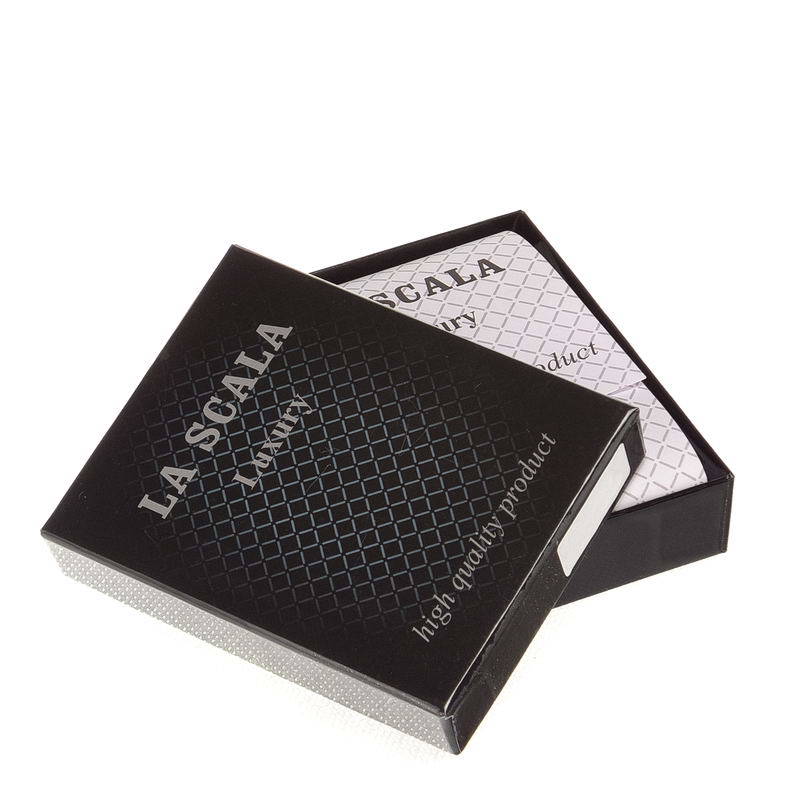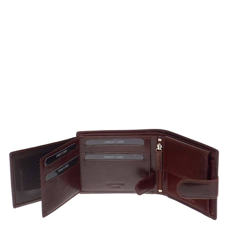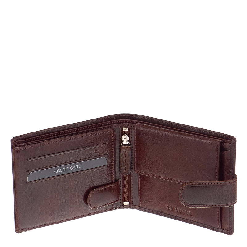 Pánská peněženka LA SCALA vyrobená z pravé italské hovězí kůže s vysokou produkční kvalitou. Víko je zdobeno jedinečným povrchovým designem. Lze jej uzamknout patentovaným externím spínacím jazykem. Jeho držák na papírové peníze má dvojitou přihrádku. Jeho držák na mince má tradiční rozložení, pod kterým byla vytvořena přihrádka na spisy. Na levé straně peněženky jsou v části upevněné samostatným spínačem také držáky karet a pořadače. Uprostřed je malá přihrádka na zip. V dárkové krabičce.