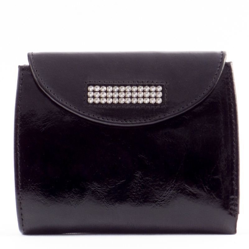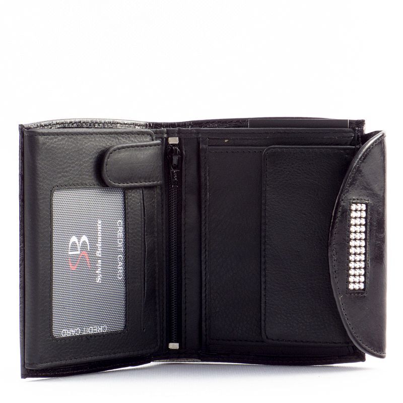 Portfel damski wykonany z błyszczącej skóry bydlęcej z dekoracją z prawdziwego kryształu Swarovskiego na wieczku. Z opatentowanym pojemnikiem na monety, dwa papierowe pojemniki na banknoty. Wewnątrz uchwyty na karty i teczki, które można zablokować za pomocą przełącznika patentowego. Wewnątrz znajduje się zapinana na zamek kieszeń na dokumenty. Jest dostarczany zapakowany w wymagające pudełko upominkowe.