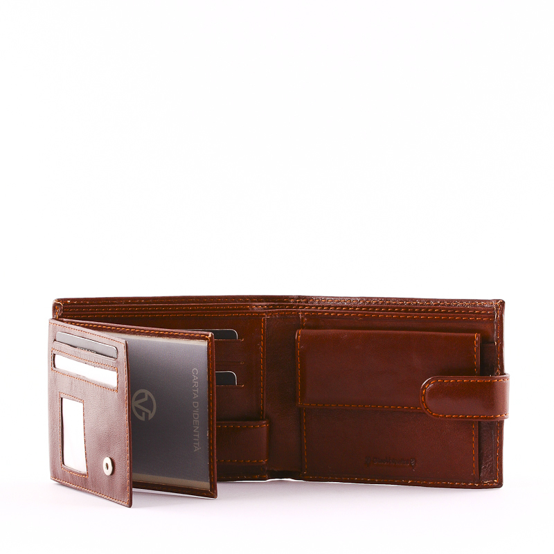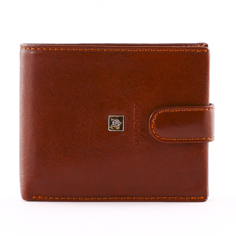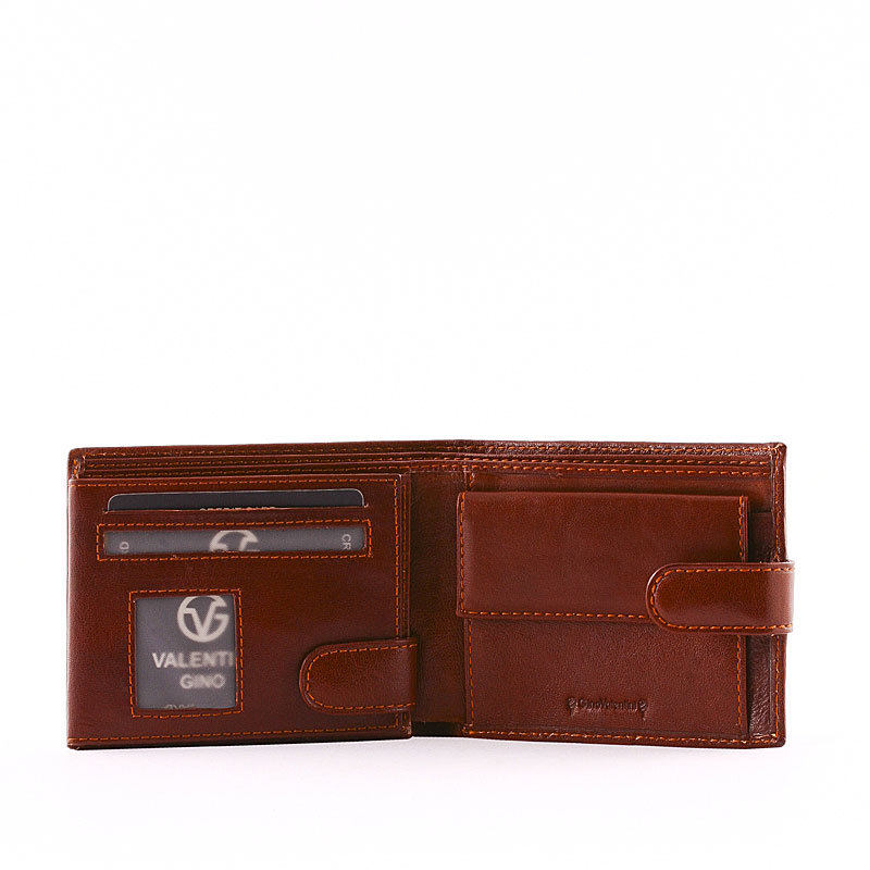 Portfel męski wykonany z błyszczącej skóry bydlęcej z opatentowanym pokrowcem, napisem Valentini i metalową blaszką. Z dwoma uchwytami na banknoty i jednym zamykanym patentem uchwytem na monety. Wewnątrz rozkładana karta i segregatory, które można zablokować za pomocą opatentowanego przełącznika.