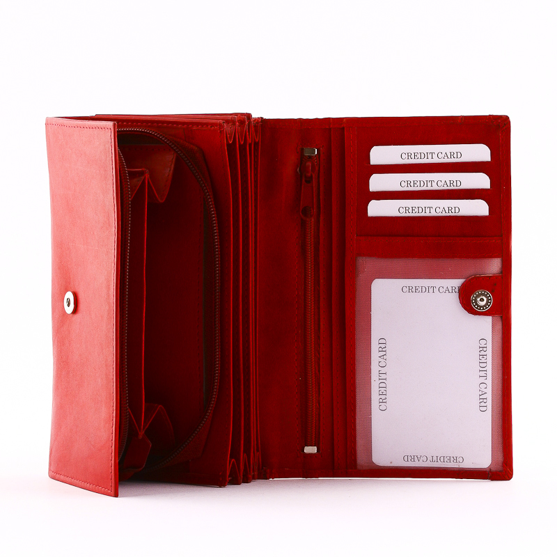 Un grande portafoglio da donna rosso realizzato in pelle bovina finemente lavorata e morbida al tatto, con un inserto a righe sul coperchio e una decorazione a X fatta a mano, guidata dal vento.