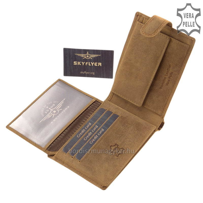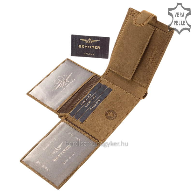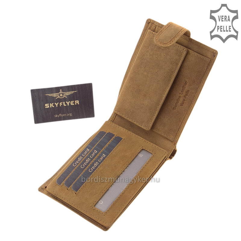 Muški novčanik u američkom stilu SKYFLYER s logotipom u svijetlosmeđoj boji, izvrsne kvalitete. Poklopac se zatvara patentiranim jezičkom za prebacivanje. Novčanik ima klasični džep za novčiće, odjeljke za papirnati novac, od kojih se jedan zatvara patentnim zatvaračem, te držač kartoteke i kartice koji se može preklopiti i sa strane. Isporučuje se s ekskluzivnom papirnatom kutijom s oznakom SKYFLYER.