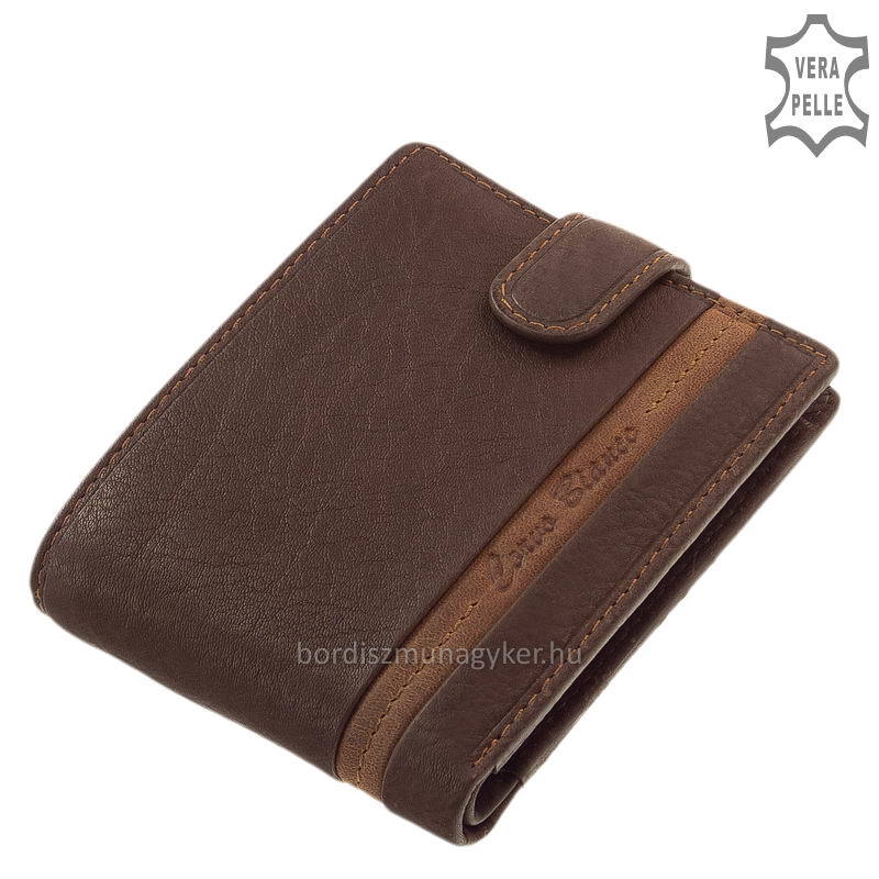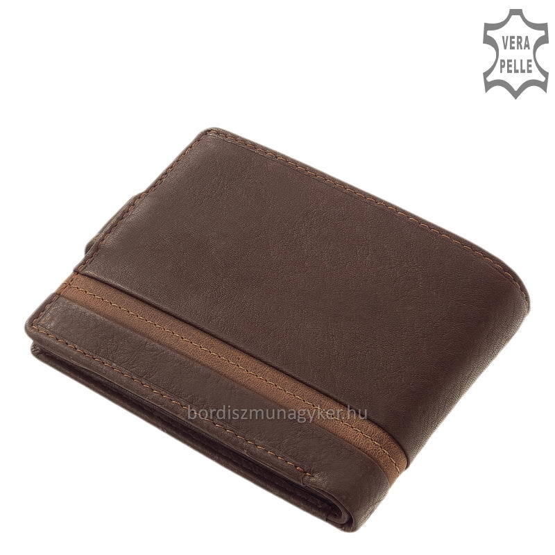 Hnedá pánska peňaženka s remienkom z lakovanej kože. Je vyrobený z robustnej, ale na dotyk veľmi kvalitnej hovädzej kože . Jeho exteriér je ozdobený športovým prešívaním a horizontálnou koženou aplikáciou.