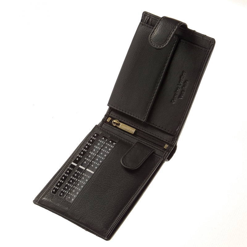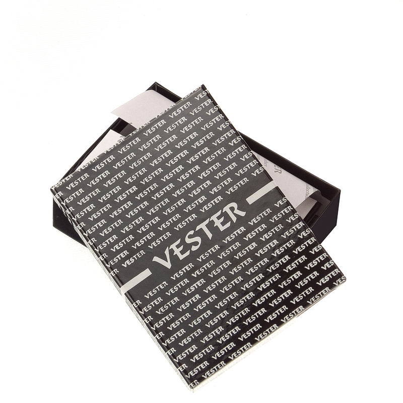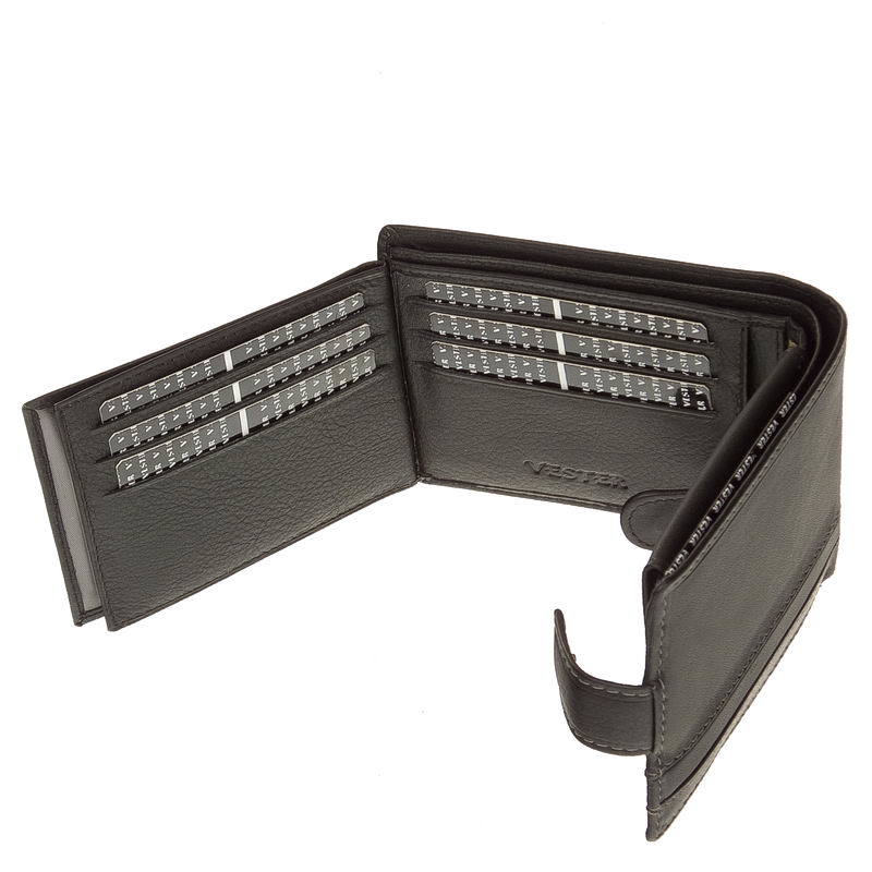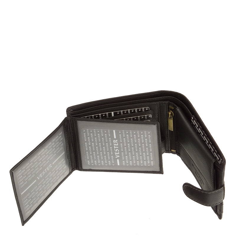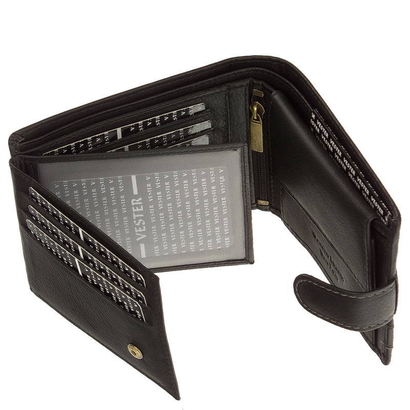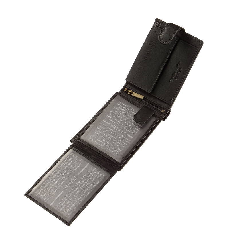 Športová elegantná pánska peňaženka značky VESTER v čiernej farbe z kvalitnej hovädzej kože napa. Veko je možné uzavrieť externým spínacím popruhom. Rozloženie peňaženky je veľmi obľúbené: vo vnútri je patentované vrecko na mince, uzamykateľný prepínač, držiak na spisy a karty na strane stránky a priehradka na papier s dvojitým oddelením a zvislým vreckom na zips v strede.
