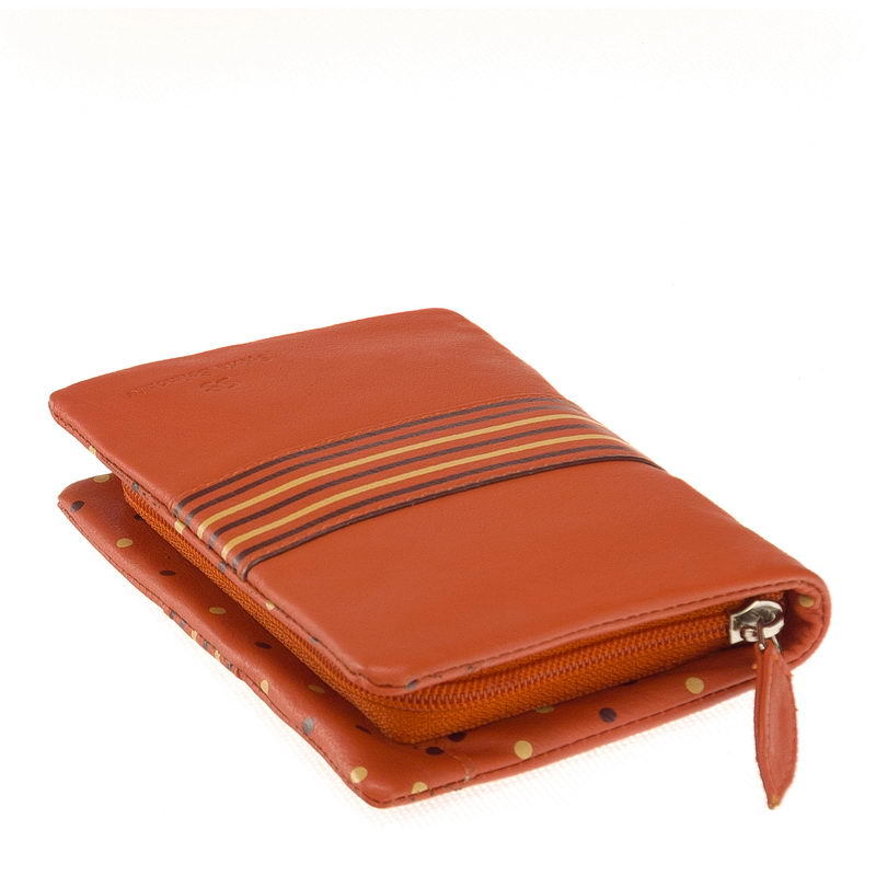 Mladistvá dámská peněženka Sylvia Belmonte z kůže nappa v oranžové barvě. Módní vzor pruhovaných puntíků činí tento produkt výjimečným. Praktický model se zapínáním na zip. Uvnitř jsou držáky papírových peněz, držák na mince na zip, kartotéky a přihrádky na karty. Příjemný, snadno použitelný a praktický model.