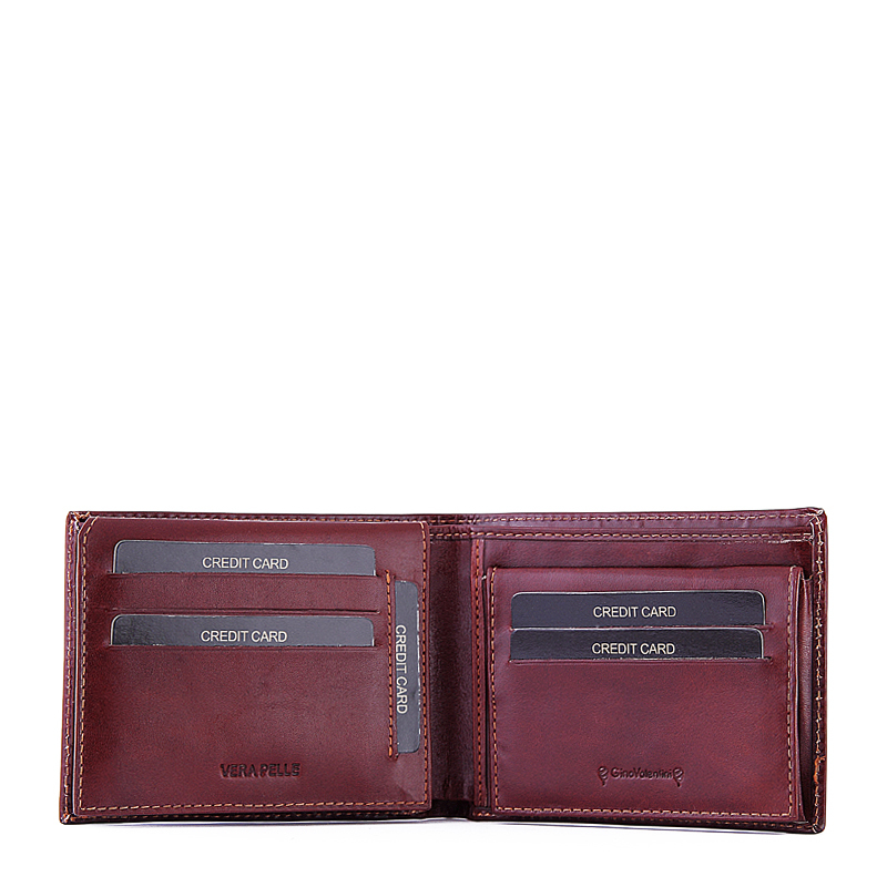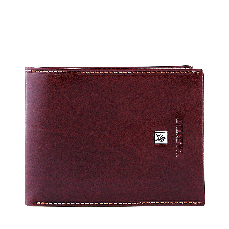 Herrenbrieftasche aus glänzendem Rindsleder mit Valentini-Aufschrift und Metallplakette. Mit zwei Papiergeldhaltern und einem patentierten abschließbaren Euro-Wechselgeldhalter. Mit ausklappbarer Karte und Ordnern im Inneren.