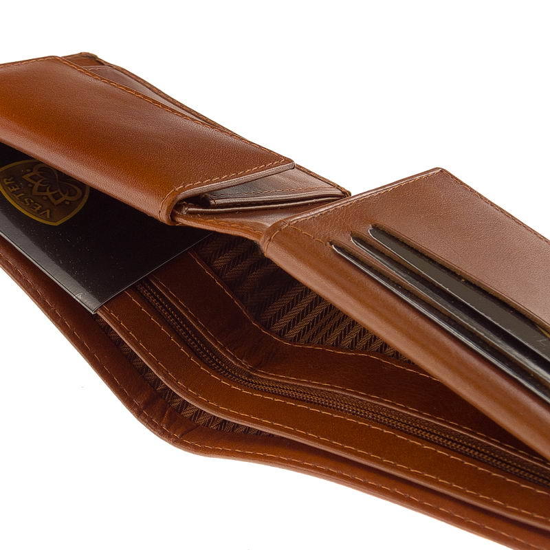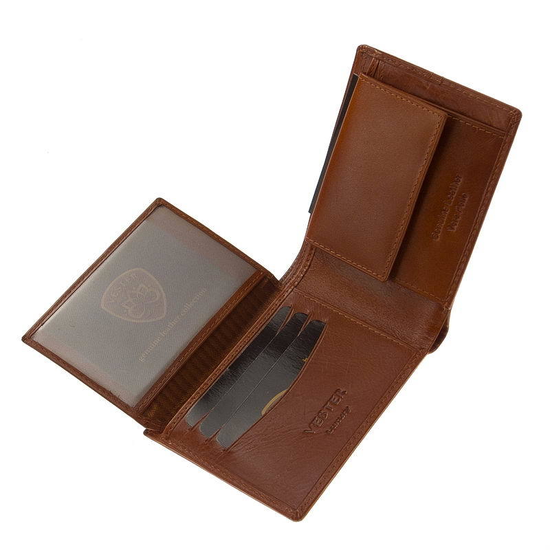 Exclusive light brown men's wallet with the VESTER LUXURY brand name on the lid, which shows a stripe decoration sewn around with decorative stapling. The material is high-quality, natural cowhide. The wallet has a two-compartment paper money pocket with an extra zippered pocket inside and a patented change coin pocket. The left side of its interior consists of an upward-scrolling file and card holder.