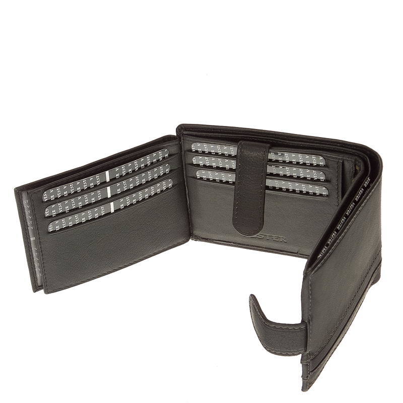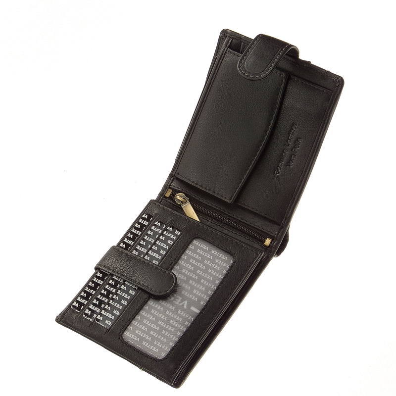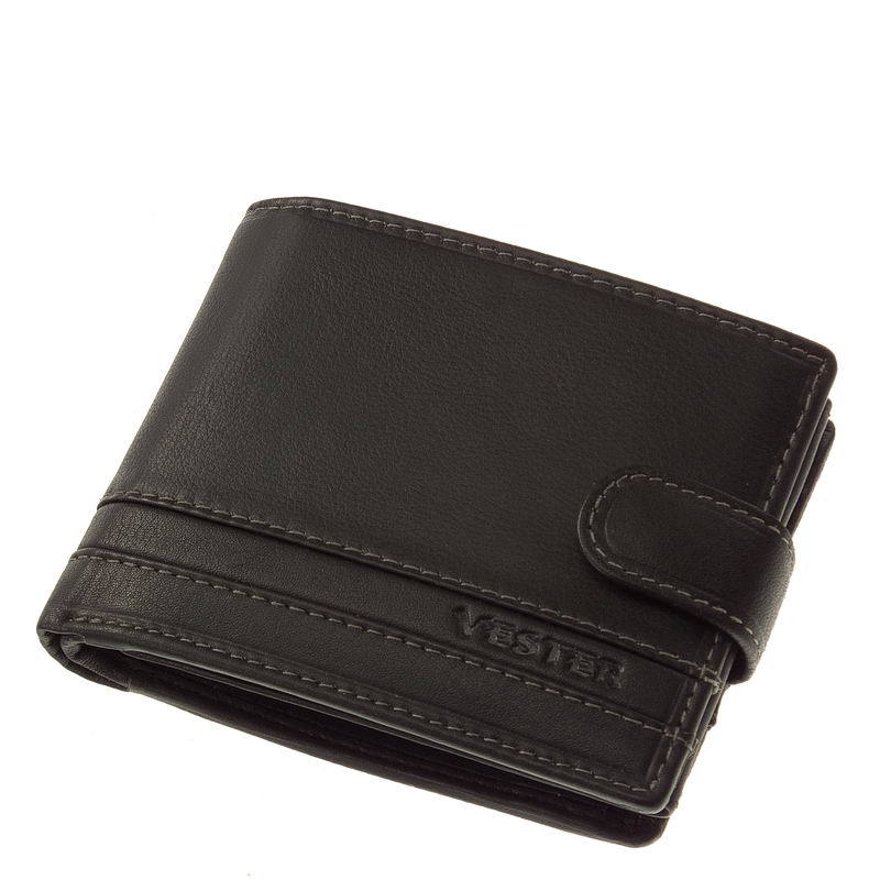 Minőségi, nappa kikészítésű marhabőrből gyártott sportos fekete színű férfi pénztárca VESTER felirattal. A termék külső átkapcsoló pánttal rendelkezik. Belül kétrészes papírpénztartót és egy aprópénztartó zsebet tartalmaz, ez alatt egy irattartó rekesz helyezkedik még el. Lapozós irat- és kártyatartó rész található a pénztárca bal oldalán, melyet átkapcsolóval zárhatjuk.